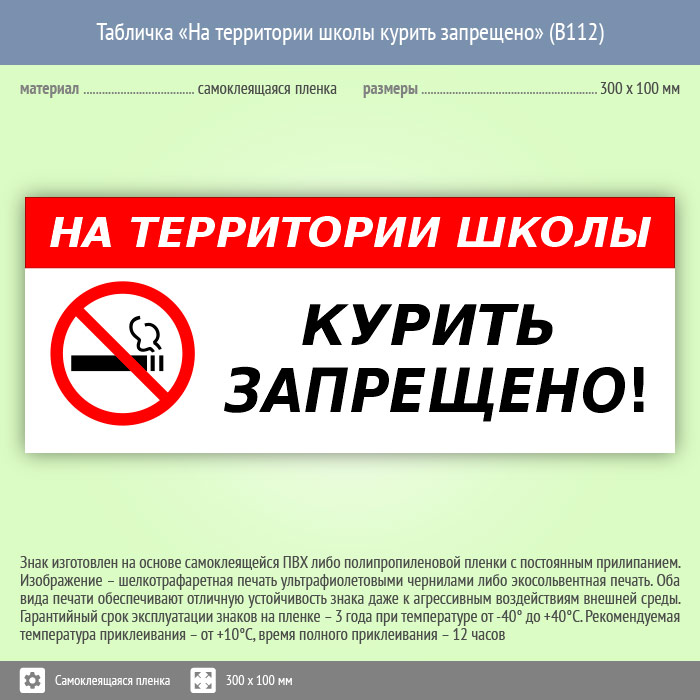Знак (табличка) «На территории школы курить запрещено» имеет размер(ы): 300х100 мм, 600х200 мм, но может быть изготовлен(а) любого размера на самоклеящейся пленке, пластике толщиной 0.5, 2 или 4 мм и металле. Также возможно применение фотолюминесцентных и световозвращающих материалов