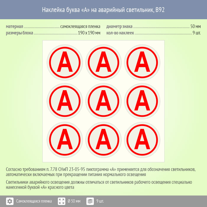 Наклейка буква «А» на аварийный светильник, B92 (пленка, диаметр 50 мм, блок 9 штук, 190х190 мм) в Новочебоксарске купить