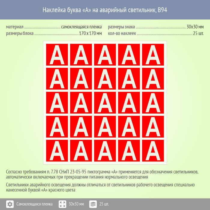 Наклейка буква «А» на аварийный светильник, B94 (пленка, 30х30 мм, блок 25 штук, 170х170 мм) в Новочебоксарске купить
