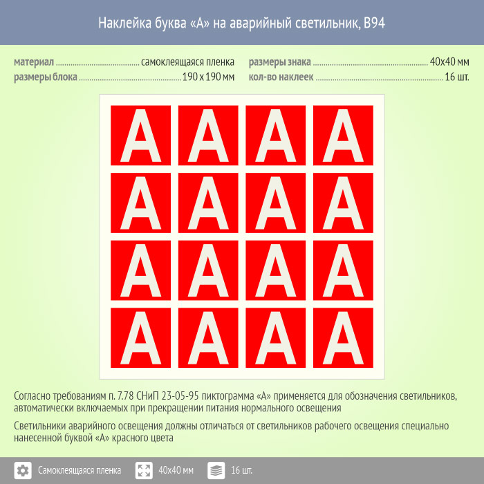 Наклейка буква «А» на аварийный светильник, B94 (пленка, 40х40 мм, блок 16 штук, 190х190 мм) в Новочебоксарске купить