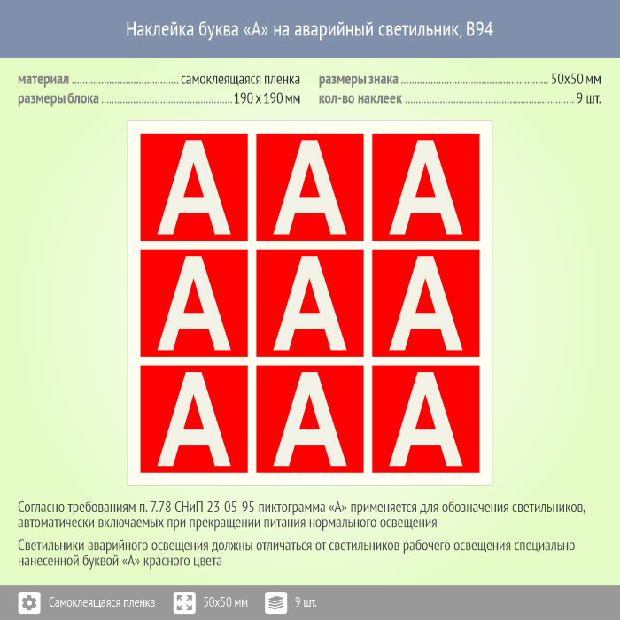 Наклейка буква «А» на аварийный светильник, B94 (пленка, 50х50 мм, блок 9 штук, 190х190 мм) в Новочебоксарске купить