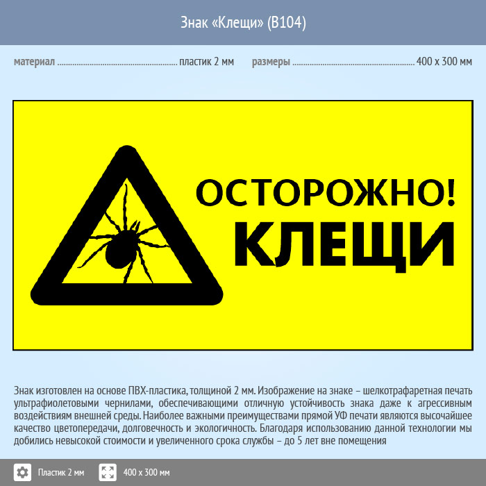 Знак «Осторожно! Клещи», B104 (пластик, 300х200 мм) в Новочебоксарске купить