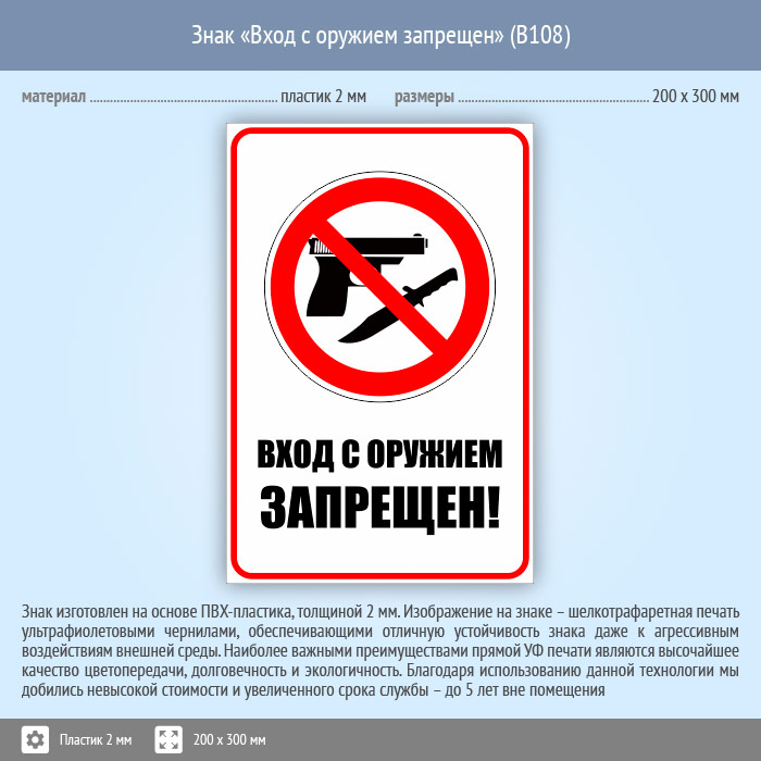 Знак «Вход с оружием запрещен», B108 (пластик, 200х300 мм) в Новочебоксарске купить