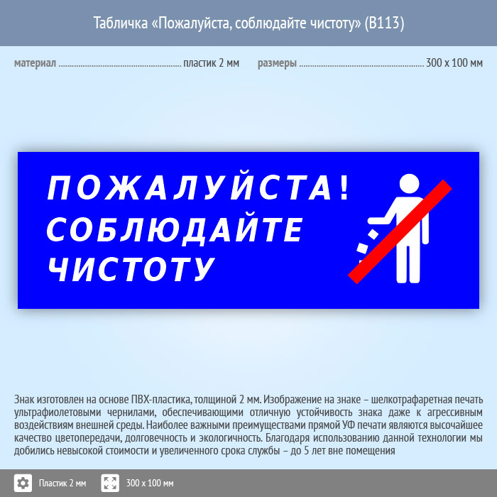 Табличка «Пожалуйста, соблюдайте чистоту», B113 (пластик, 300х100 мм) в Новочебоксарске купить