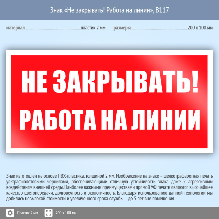 Знак «Не закрывать! Работа на линии», B117 (пластик, 200х100 мм) в Новочебоксарске купить