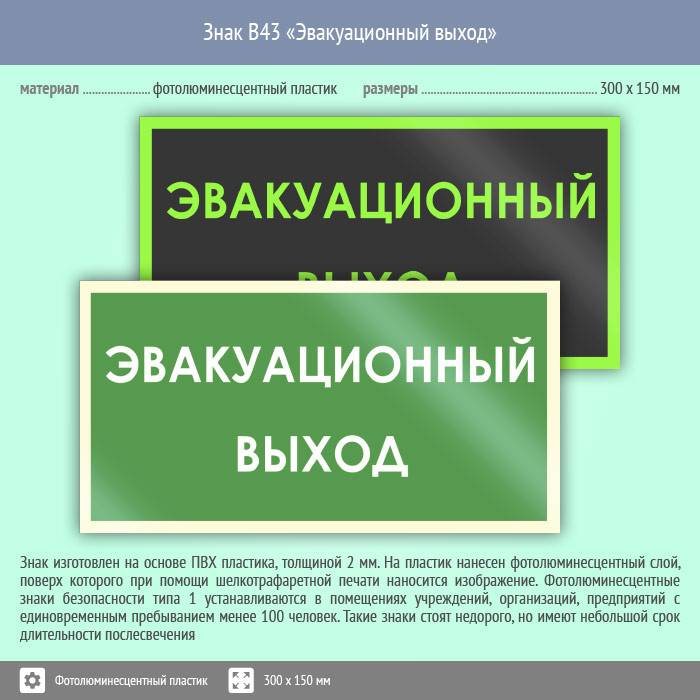 Знак B43 «Эвакуационный выход» (фотолюминесцентный пластик, 300х150 мм) в Новочебоксарске купить