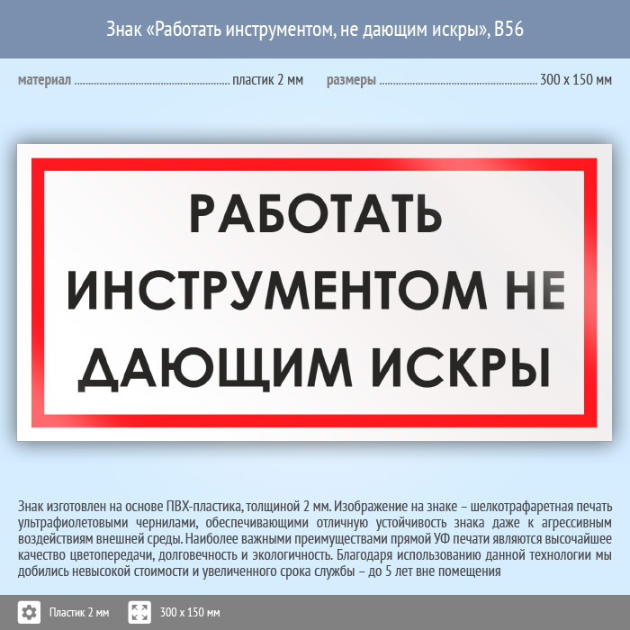 Знак «Работать инструментом, не дающим искры», B56 (пластик, 300х150 мм) в Новочебоксарске купить
