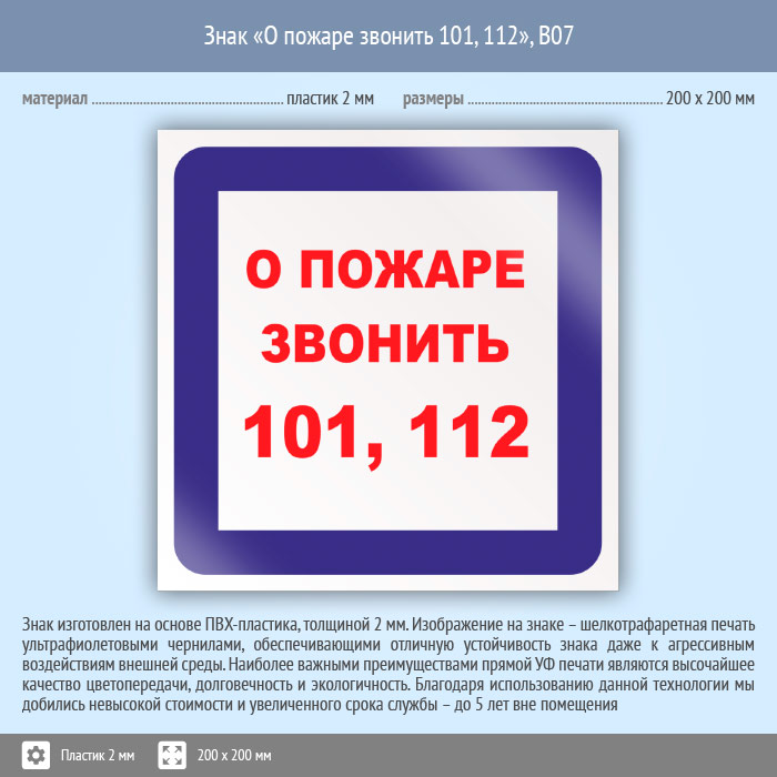Знак «О пожаре звонить 101, 112», B07 (пластик, 200х200 мм) в Новочебоксарске купить