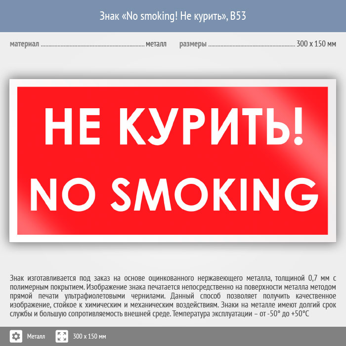 Знак «No smoking! Не курить», B53 (металл, 300х150 мм) в Новочебоксарске купить