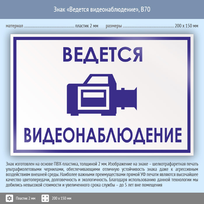 Знак «Ведется видеонаблюдение», B70 (пластик, 200х150 мм) в Новочебоксарске купить