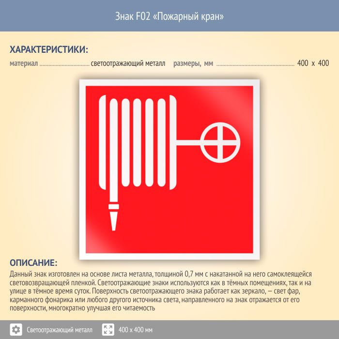 Знак F02 «Пожарный кран» (светоотражающий металл, 400х400 мм) в Новочебоксарске купить