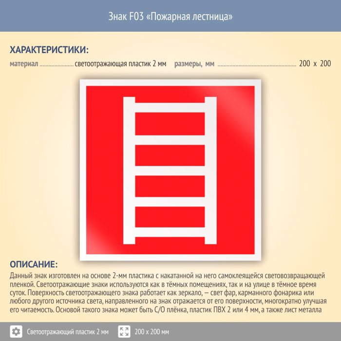 Знак F03 «Пожарная лестница» (светоотражающий пластик, 200х200 мм) в Новочебоксарске купить