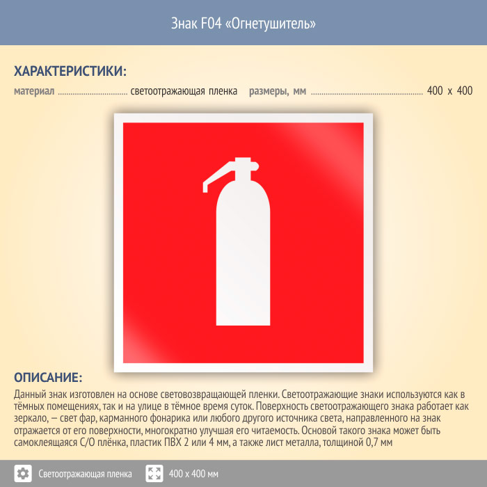 Знак F04 «Огнетушитель» (светоотражающая пленка, 400х400 мм) в Новочебоксарске купить