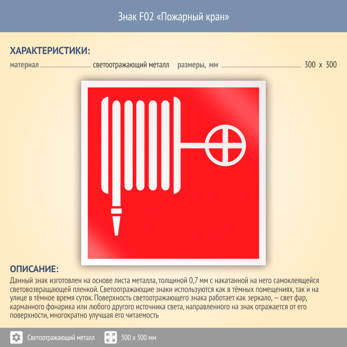 Знак F02 «Пожарный кран» (светоотражающий металл, 300х300 мм) в Новочебоксарске купить