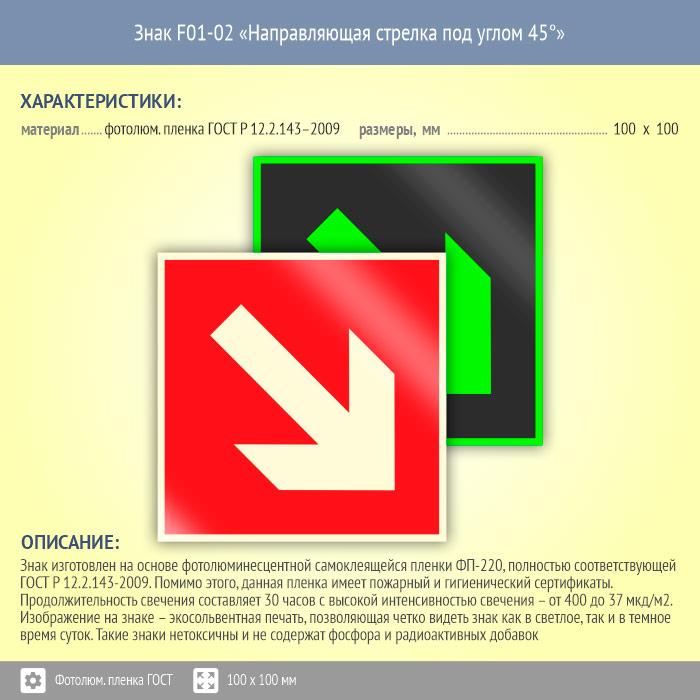 Знак F01-02 «Направляющая стрелка под углом 45°» (фотолюминесцентная пленка ГОСТ 34428-2018, 100х100 мм) в Новочебоксарске купить