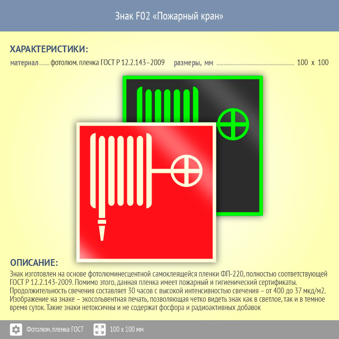 Знак F02 «Пожарный кран» (фотолюминесцентная пленка ГОСТ 34428-2018, 100х100 мм) в Новочебоксарске купить
