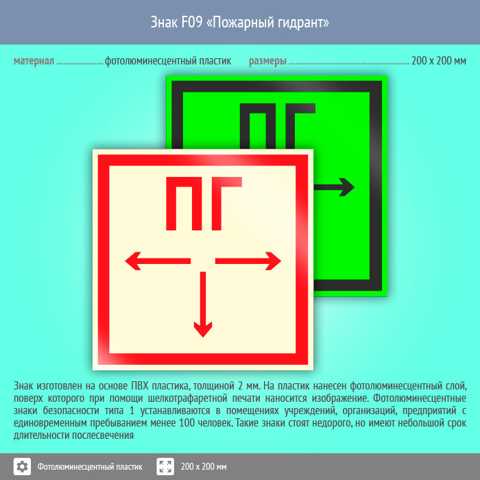 Знак F09 «Пожарный гидрант» (фотолюминесцентный пластик, 200х200 мм) в Новочебоксарске купить