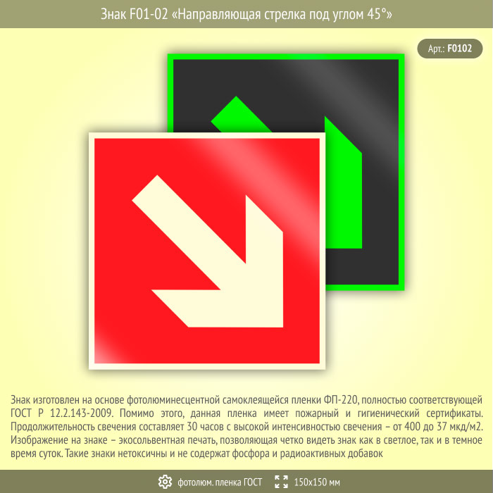 Знак F01-02 «Направляющая стрелка под углом 45°» (фотолюминесцентная пленка ГОСТ 34428-2018, 150х150 мм) в Новочебоксарске купить