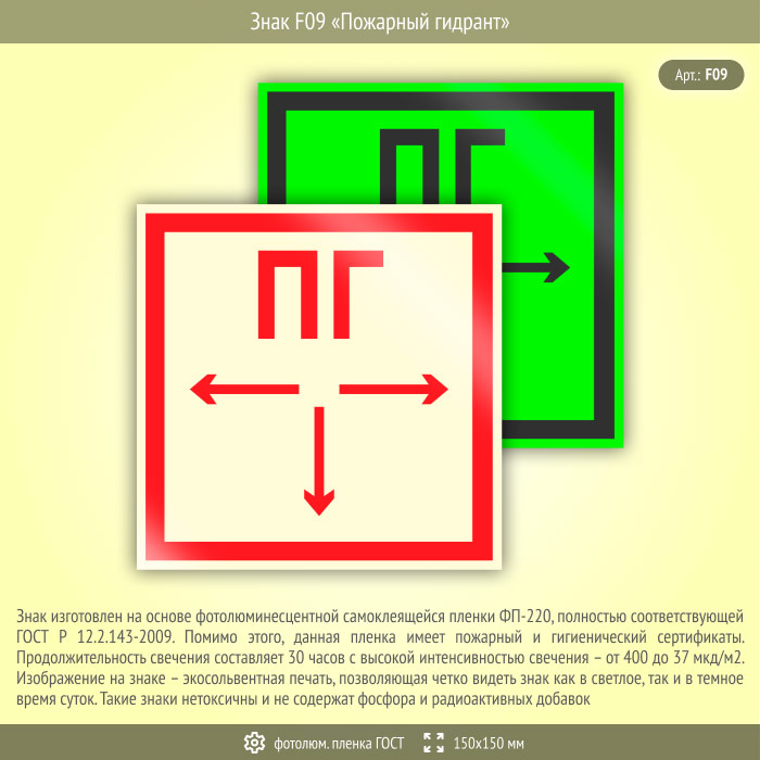 Знак F09 «Пожарный гидрант» (фотолюминесцентная пленка ГОСТ 34428-2018, 150х150 мм) в Новочебоксарске купить
