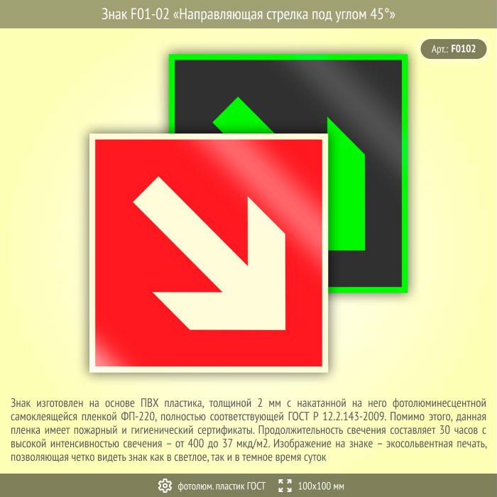 Знак F01-02 «Направляющая стрелка под углом 45°» (фотолюминесцентный пластик ГОСТ 34428-2018, 100х100 мм) в Новочебоксарске купить