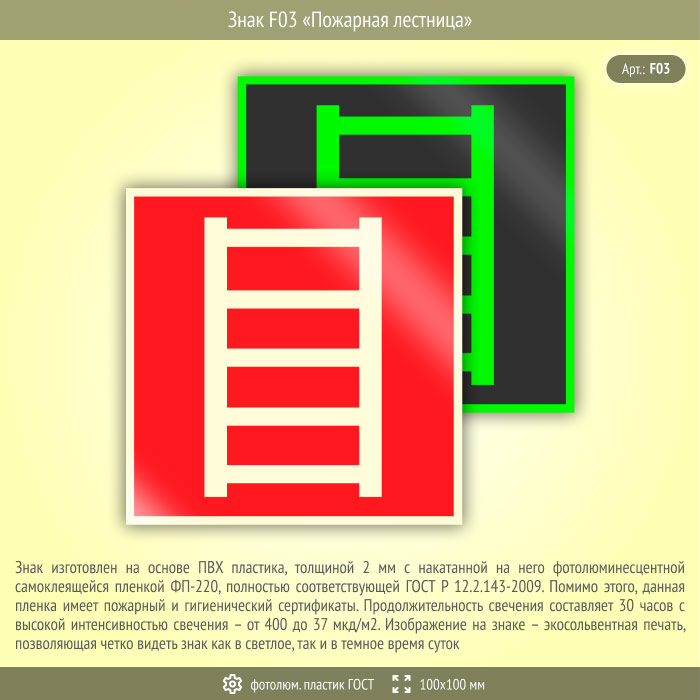 Знак F03 «Пожарная лестница» (фотолюминесцентный пластик ГОСТ 34428-2018, 100х100 мм) в Новочебоксарске купить