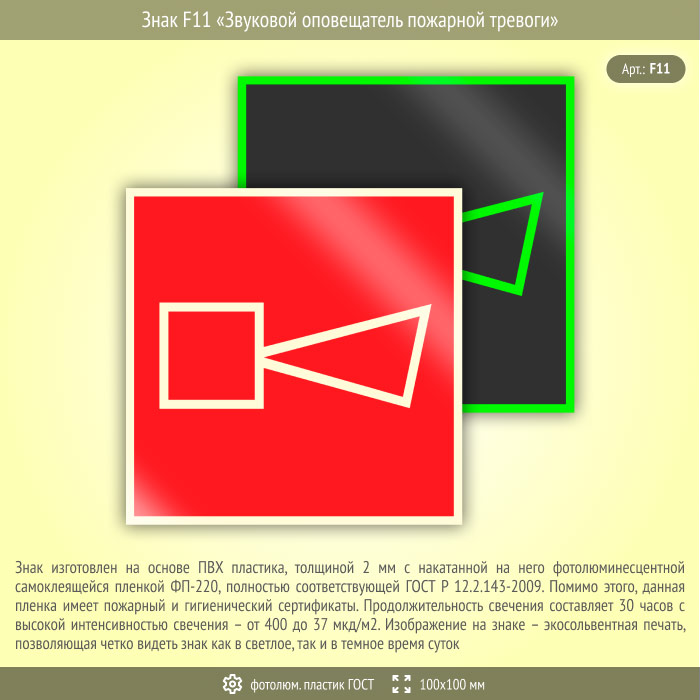 Знак F11 «Звуковой оповещатель пожарной тревоги» (фотолюминесцентный пластик ГОСТ 34428-2018, 100х100 мм) в Новочебоксарске купить