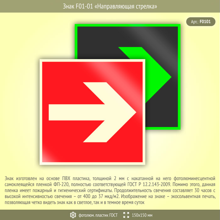 Знак F01-01 «Направляющая стрелка» (фотолюминесцентный пластик ГОСТ 34428-2018, 150х150 мм) в Новочебоксарске купить