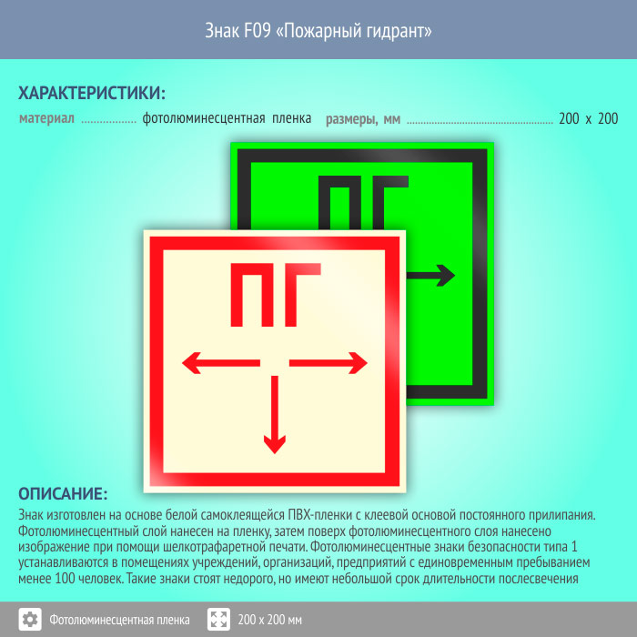 Знак F09 «Пожарный гидрант» (фотолюминесцентная пленка, 200х200 мм) в Новочебоксарске купить