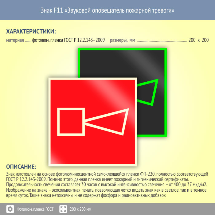 Знак F11 «Звуковой оповещатель пожарной тревоги» (фотолюминесцентная пленка ГОСТ 34428-2018, 200х200 мм) в Новочебоксарске купить