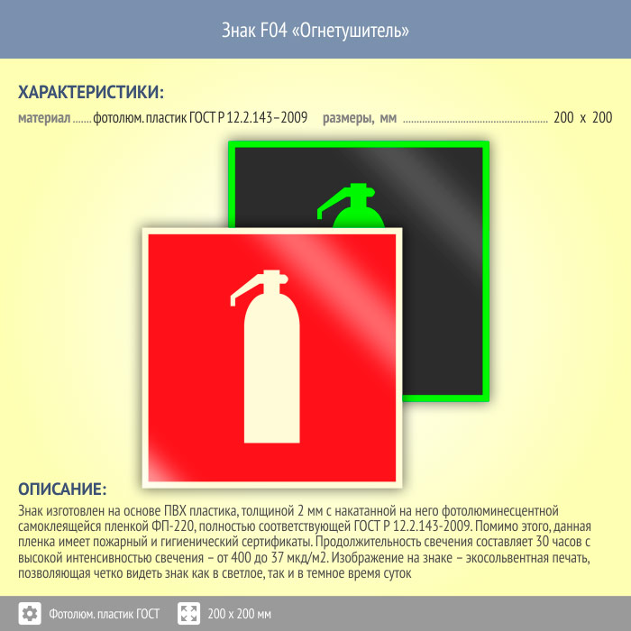 Знак F04 «Огнетушитель» (фотолюминесцентный пластик ГОСТ 34428-2018, 200х200 мм) в Новочебоксарске купить