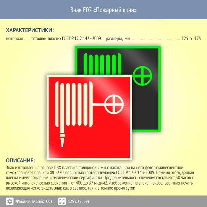 Знак F02 «Пожарный кран» (фотолюминесцентный пластик ГОСТ 34428-2018, 125х125 мм) в Новочебоксарске купить
