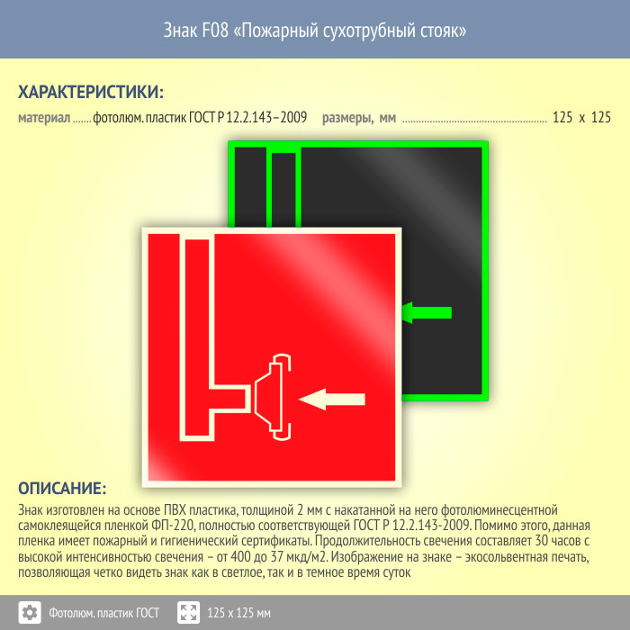 Знак F08 «Пожарный сухотрубный стояк» (фотолюминесцентный пластик ГОСТ 34428-2018, 125х125 мм) в Новочебоксарске купить