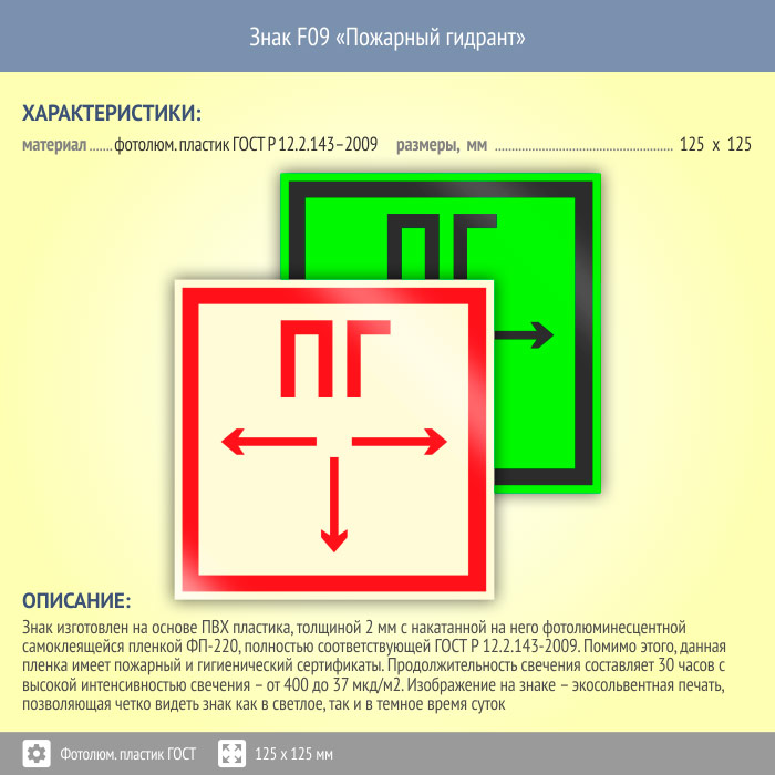 Знак F09 «Пожарный гидрант» (фотолюминесцентный пластик ГОСТ 34428-2018, 125х125 мм) в Новочебоксарске купить